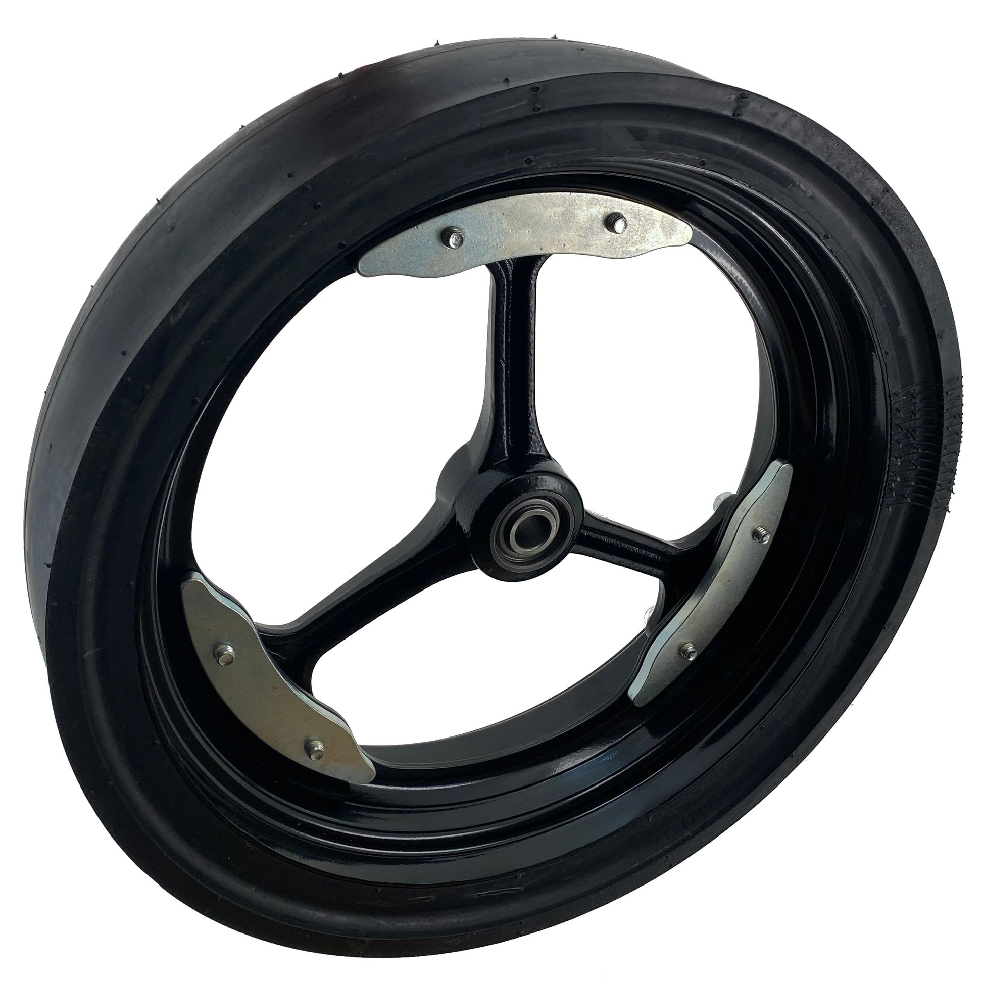 Specifications: Style B3, Diameter (mm) 15.827IN, Wheel Width 4.429IN, Axle Diameter 0.634IN, Hub Width 1.862IN, Offset 0.00IN, Roller Bearing - Y/N Y, Grease Fitting N, Color BLACK, Material RUBBER_STEEL, Finish K.