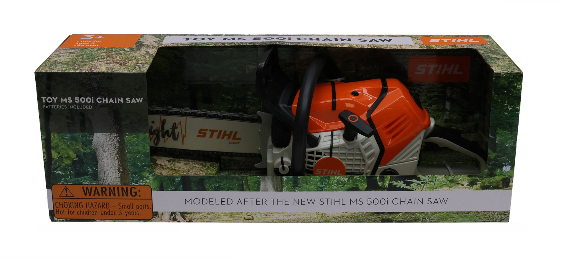 Unleash the fun with the new battery-powered toy chainsaw, inspired by the cutting-edge STIHL MS 500i. This entry-level tool for young enthusiasts brings the thrill of real chainsaw action to playtime, featuring a movable, interchangeable chain, a bright LED operation indicator, and a refreshed bar design. Plus, with a parent-friendly volume control, the authentic saw sounds can be easily adjusted to keep playtime pleasant. It's the perfect way for kids to experience the excitement of the outdoors, just like the grown-ups.